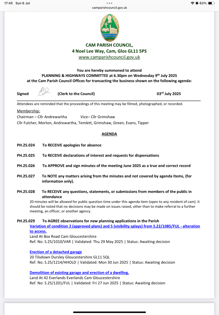 2. Part 1 of PS24 (Persimmon land behind Millwood Motors) will be put before SDC Development Control Committee on Tuesday, 15th July at 6pm – S.21/1875/OUT – Hybrid application for residential development up to 795 dwellings comprising of 226 dwellings of a full application and remaining balance of up to 569 dwellings as an outline planning application (with all matters reserved), with supporting infrastructure and enabling works including: new vehicular access off the A4135, public open space, landscaping and drainage infrastructure. Now Highways has miraculously solved Junction 14 capacity issues itβs all systems go π