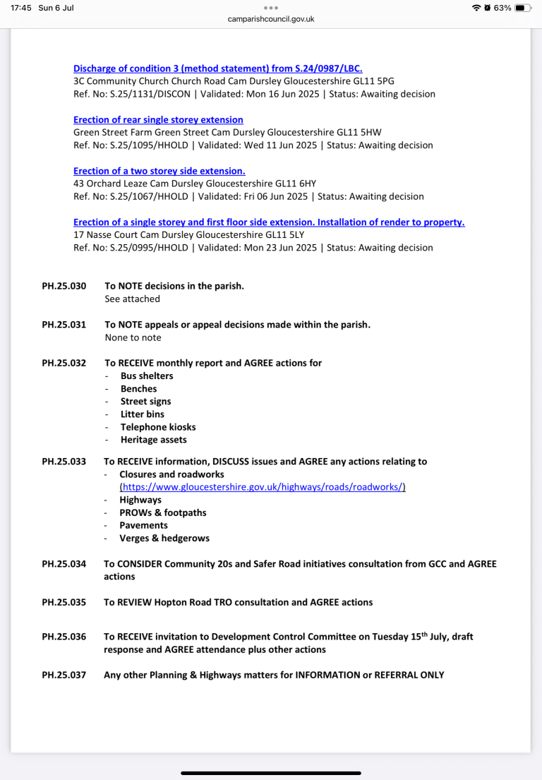 Planning & Highways Meeting 15/7/25 6:30pm