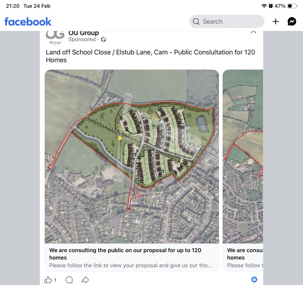 The latest potential speculative application to hit Cam! Please DO NOT complete the online survey – it’s completely rigged in the developer’s favour and does not allow you to change an answer once you’ve clicked on a button. We know from experience that these so called consultations are always interpreted in favour of the developer (remember Bowers Lea). We already have c1000+ houses with permission (266 by Kerry Foods and c795 by Millwood garage about to start) in Cam and another c600+ in the draft local plan plus an appeal in motion for 73 at Taits Hill – when is enough, enough? We are quickly turning into Kingsway/Quedgley/Yate. Let’s not give them more ammunition to build on green fields.