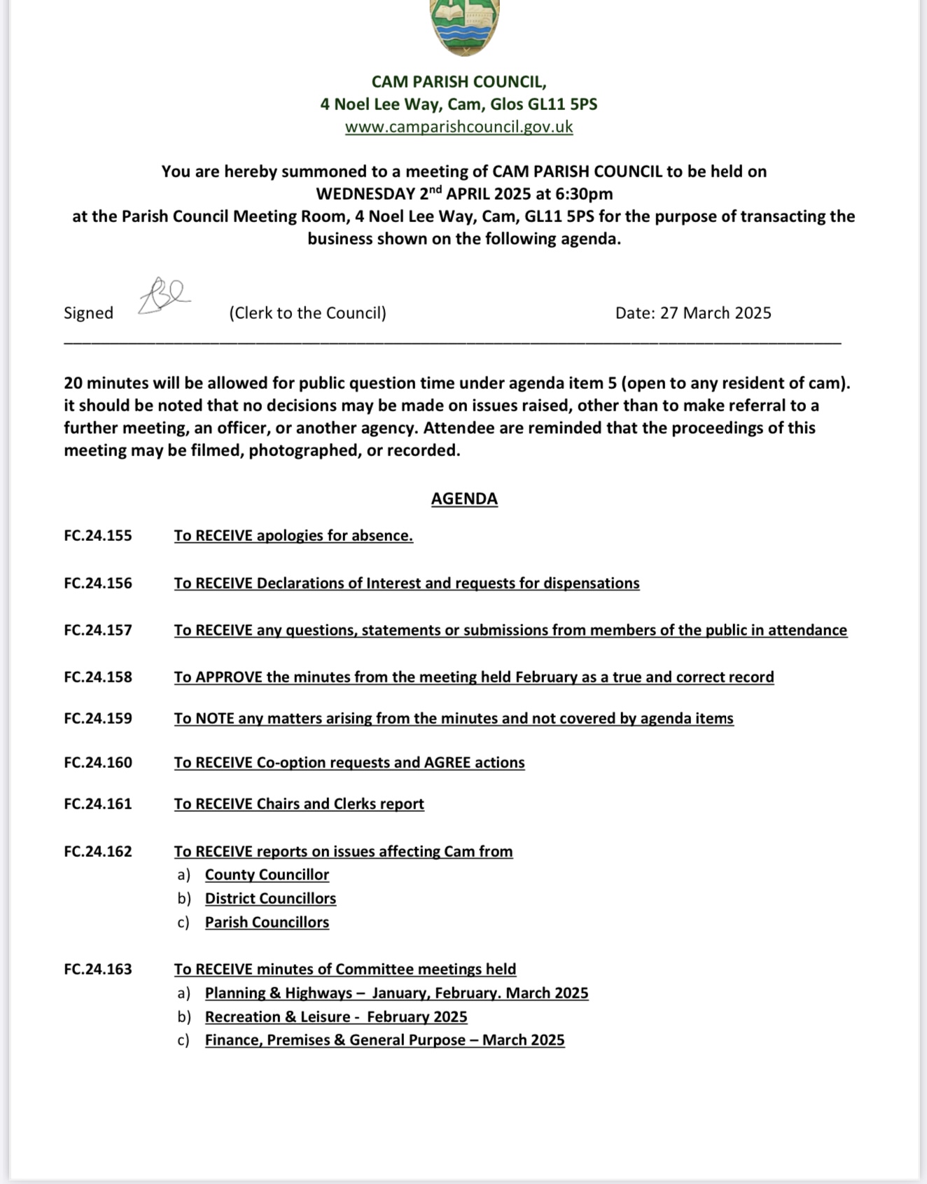 The next Cam Parish Council Full Council Meeting is this Wednesday, 2nd April at 18:30.