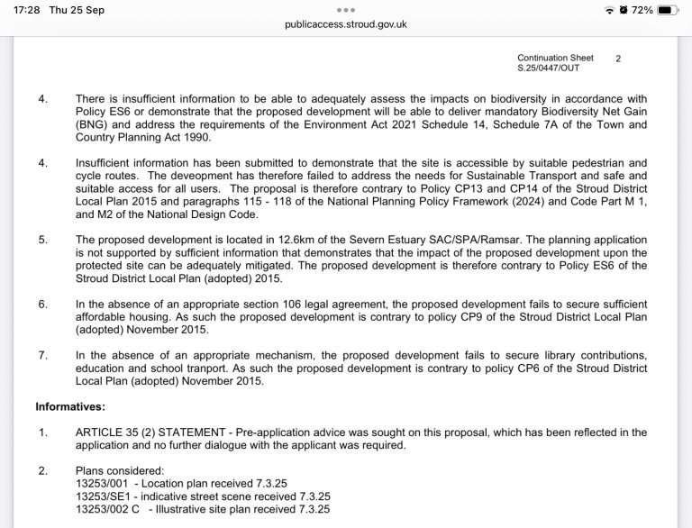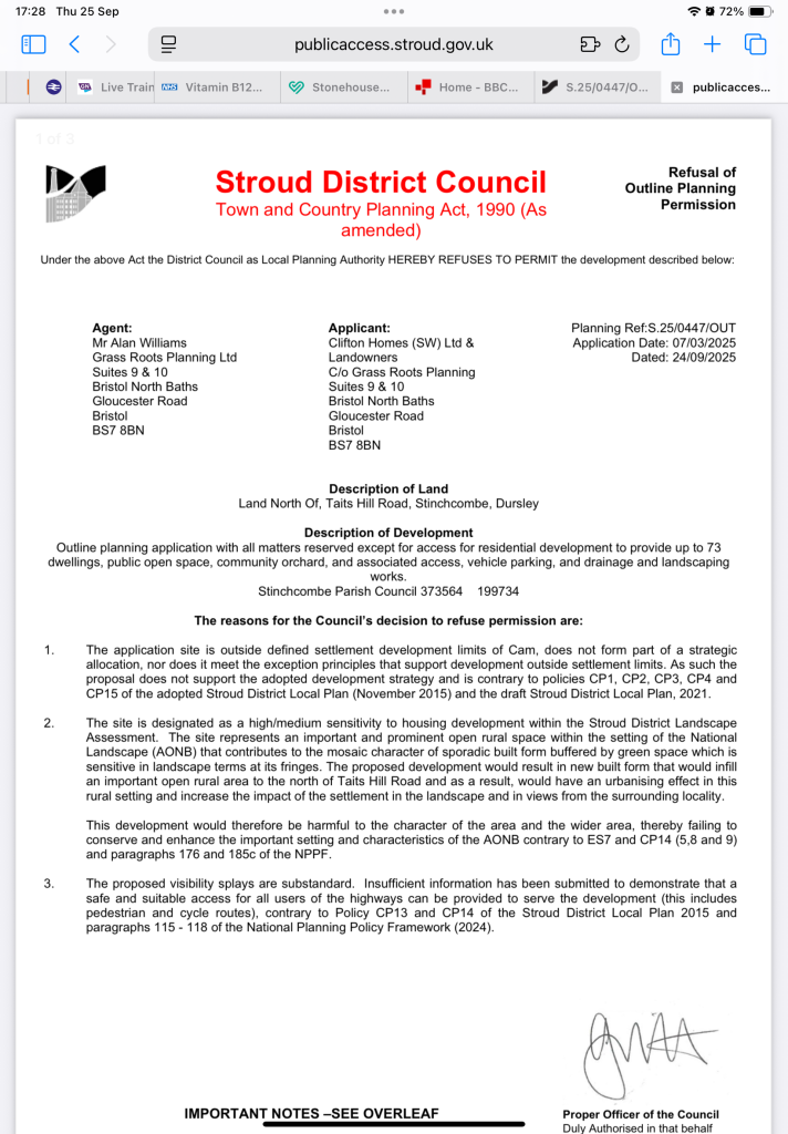 Thank you to all those who wrote in to SDC with comments and objections to this application which would have completely blighted the open countryside of Taits Hill, destroyed the separation of Cam and Stinchcombe and undoubtedly caused a lot of road safety issues. It also goes to show that when residents and parish/town councils support one another we can influence these planning decisions. Yes, they may well appeal but they have a lot of hurdles to jump if they do!